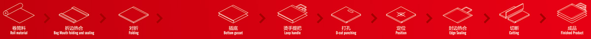 工序流程:卷筒料一折邊一穿繩一熱合-對折一插邊-定位~-打 孔---熱合---切斷---收集成品。